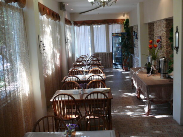 В цену номера входит завтрак (стандартное время, с 8 до 10.30 и ни минутой позже), его накрывают в отельном кафетерии. Все без изысков, простенько и почти по-домашнему без выбора: каша (бывает молочная и на воде), запеканки, бутерброды, сосиски, изредка оладьи. Подают пакетированный неважнецкий чай и довольно гадкий растворимый кофе, молоко к которому не положено. Праздник живота во все остальные часы в этом же оазисе общепита нужно оплачивать дополнительно: с 13.00 до 16.00 подают комплексные обеды, после 18.00 – ужин по полному меню. Уж их-то можно заказать и в номер, но гости этой услугой пользуются редко, да и вообще как-то не слишком ценят талант местной поварихи.