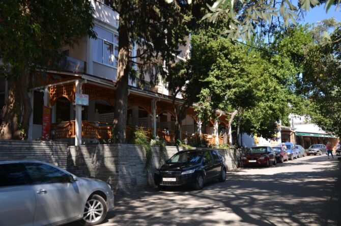 Отель «Алупка» расположен вполне удачно, на улице Фрунзе — чуть ли не в самом сердце города, всего в паре сотен метров от моря. Но не надо забывать, что все курортные города на ЮБК – это тесные улочки, нависающие окнами над проезжей частью. Главная ценность тут – квадратные метры, поэтому плотность застройки впечатляет и очень пугает страдающих клаустрофобией. Так и с улицей Фрунзе, тетрисообразно застроенной кафешками, сувенирными лавками, шашлычными, экскурсионными бюро, саунами и разнообразными отельчиками, не превышающими три звезды.
