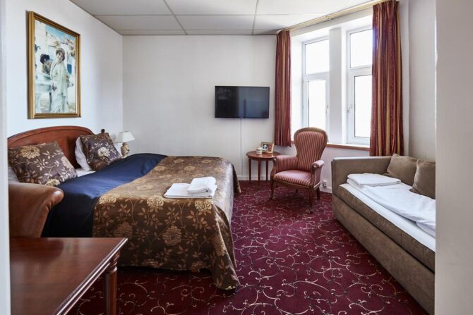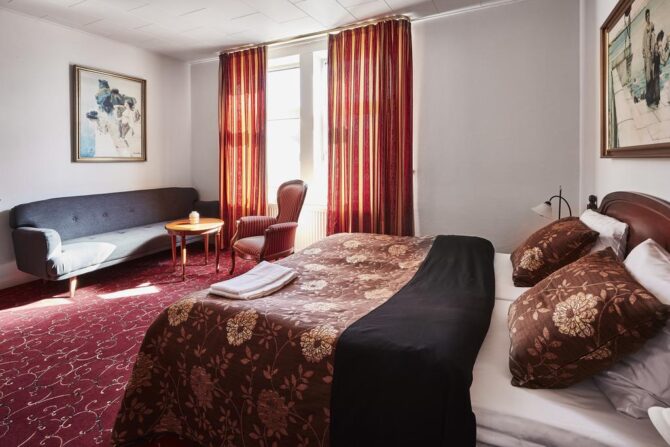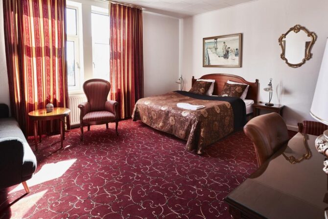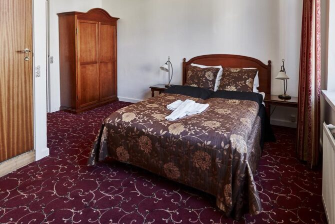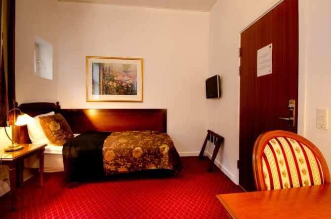 Отель в Оденсе по своим размерам – не самый крупный в Европе. Однако 74 среднего размера номера помимо того, что оборудованы всем необходимым, внутренним своим интерьером полностью соответствуют внешнему облику Ansgar, да и всего Оденсе. Венецианские кресла, барочные шкафы и секретеры, светлые оттенки стен и потолков, на полу – непременно насыщенно-красное, или оливково-салатовое с белым ковровое покрытие. Полная иллюзия того, что это – часть дворцовых покоев датского монарха, а не современный гостиничный номер, в котором есть санузел в стиле hi-tech, телефон, телевизор, подключенный к сателлиту, а где-то в стенке за нишей прячется солидный мини-бар. Сразу хочется вести себя очень-очень по-взрослому, выпрямить спину и вообще, держать марку. Поэтому, когда горничная приходит с ежедневной уборкой номера, или для того, чтобы сменить постельное бельё, из головы вылетают все-все мысли, кроме чопорно-вежливых фраз, начинающихся с «Вы не могли бы…» или «Я был бы Вам очень признателен…»