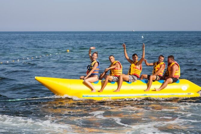 Работает прокат гидроциклов, катамаранов, небезызвестных «бананов». Суперпопулярна единственная в Крыму станция флайбординга. За всем происходящим внимательно следят спасатели, для детей есть специальные жилеты. Функционирует бар, там делают фруктовые коктейли и шейки для детей.