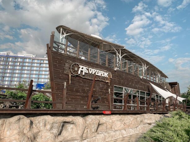 В здании, стилизованном под пиратский корвет, расположился лучший в Крыму ресторан sea-food (по их собственному признанию). Все может быть, ведь у них есть большой аквариум с еще пока живыми обитателями морей, которых планируют съесть.