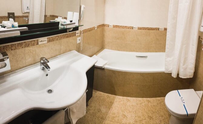 В каждом номере есть сейф, телевизор, исправно работает вай-фай, есть мини-бар. Безусловное преимущество – центральная вентиляция и кондиционирование. По правилам, уборка номера и смена постельного белья с полотенцами проводится ежедневно.