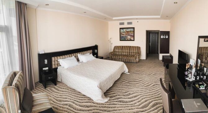 - Двухкомнатный люкс (71 м2) с видом на море и город. Спальня и гостиная, есть возможность совместить с номером для охраны, няни или сопровождения.