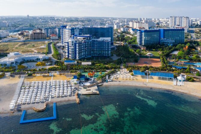 Очевидно, что гранд-отель Aquamarine Resort & Spa мог появиться только в Севастополе. Феодосия или Евпатория такое сокровище точно не потянули бы – размах не тот. Ведь отель входит в состав целого курортного комплекса: