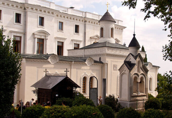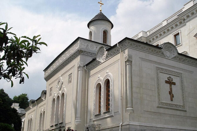 Построена рядом с Ливадийским дворцом по желанию императрицы Марии Александровны. Ее архитектором стал Монигетти, а прототипом — церковь Святого Луки. Византийский стиль был выбран для храма, который собирались сделать хранилищем ценностей и реликвий царской семьи.