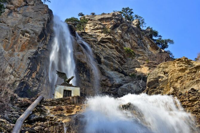 В ялтинских горах, на высоте 400 м над уровнем моря находится уникальная природная достопримечательность, известная на весь мир. Это красивейший водопад высотой почти 100 м, который за свой буйный нрав местные прозвали “летящей водой”. Зимой, когда приходят морозы, вода замерзает и все происходящее превращается в ледопад.