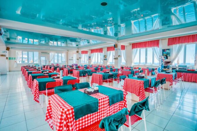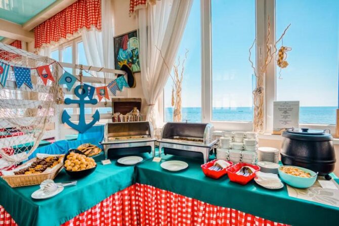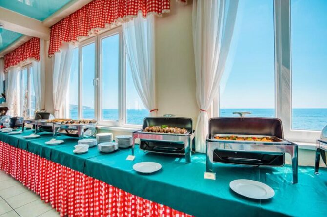 - Ресторан “Прибрежный” для питания всех гостей расположен на верхнем этаже корпуса и также может похвастаться идеальными морскими панорамами.
