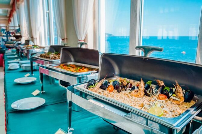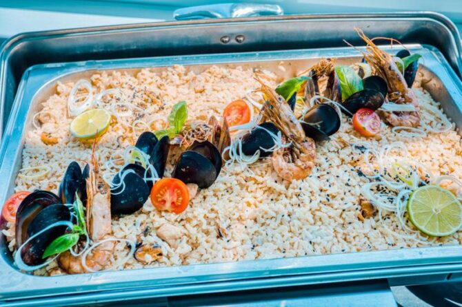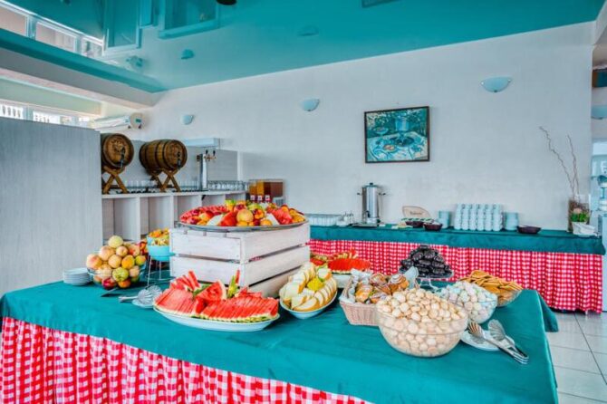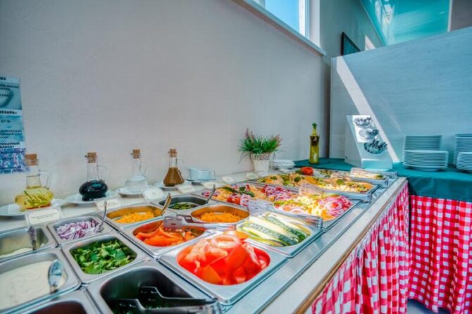 В проживание включено 3-х разовое питание по системе шведского стола в течение высокого сезона (июнь — сентябрь). Речь идет о корпусе “Азор”, и гости посещают ресторан “Прибрежный”.