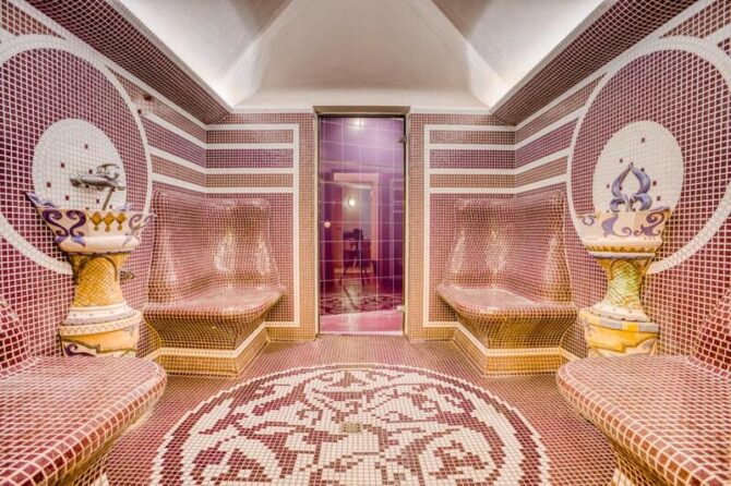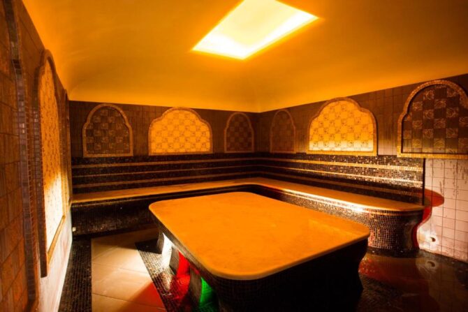 - Хаммам — турецкая парная — идеально подходит для многих благодаря низкой влажности и температуре воздуха. Здесь устраивают целые посиделки в комнате отдыха за крымским чаем.
