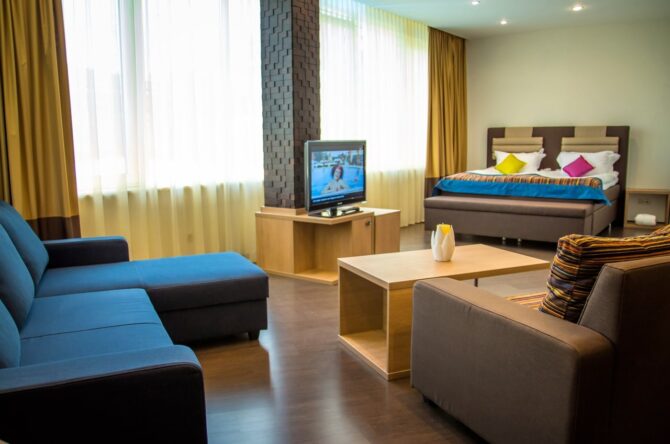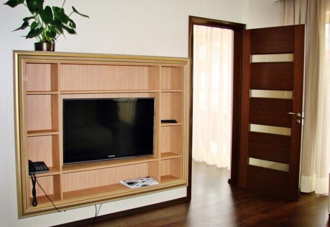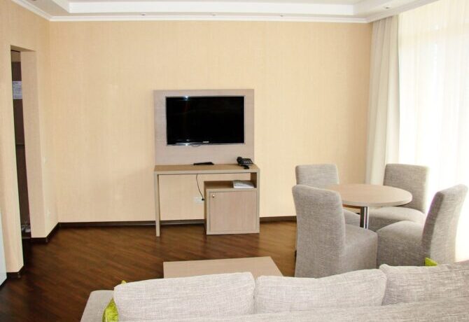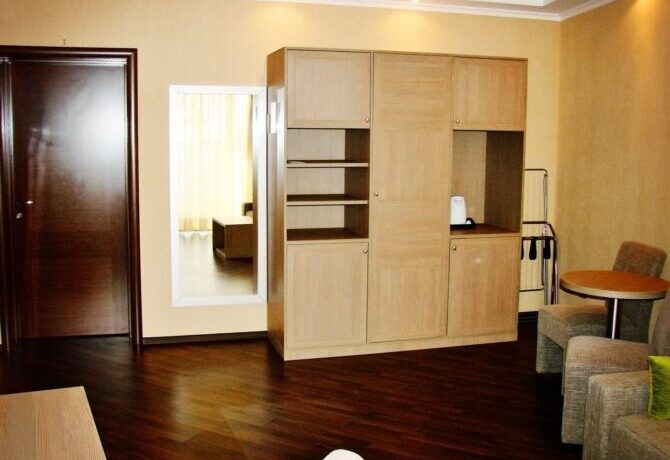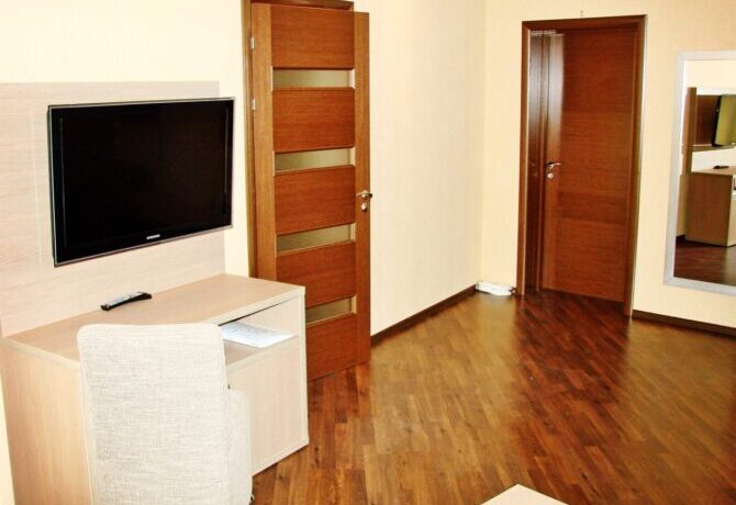 - «Полулюкс». Номер со спальней с двуспальной кроватью, гостиной и мини-кухней. Общая площадь помещения 41,25 квадратных метров..