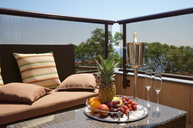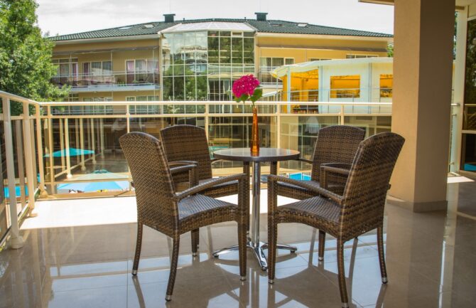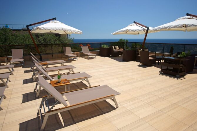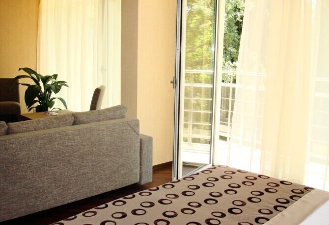 - «Полулюкс улучшенный». Студия с двуспальной кроватью, зоной отдыха, джакузи. Подготовлен к двухместному размещению с возможностью дополнительного места. Площадь 57. Балкон — уединенная терраса с видом на море.