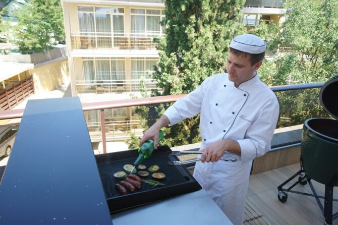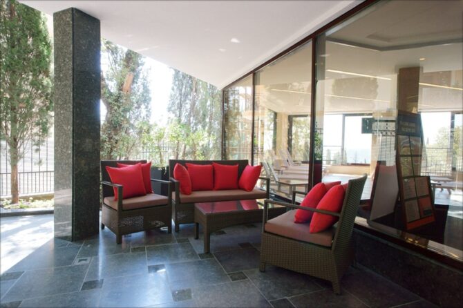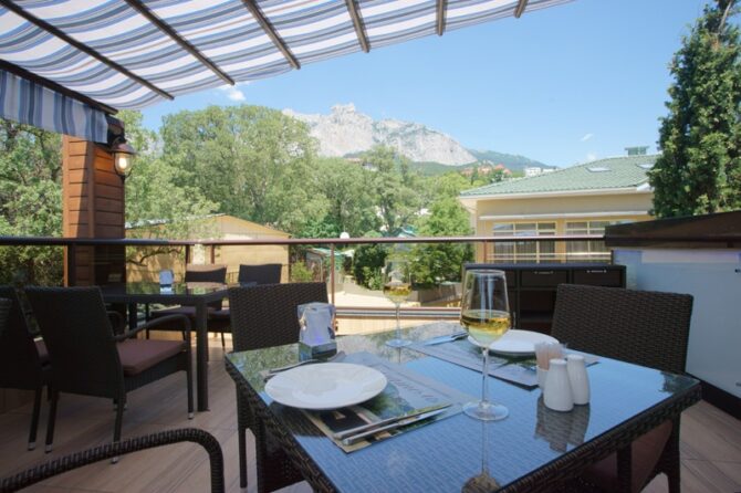 А на летней террасе кафе можно любоваться великолепным видом на горы и горизонт.