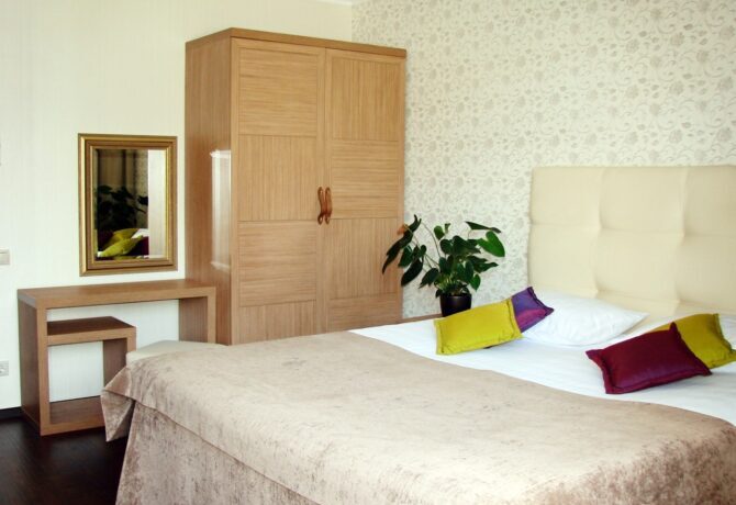 - «Стандарт плюс». — спальня с двухспальной кроватью. Подготовлен к двухместному размещению с возможностью добавления дополнительной кровати (раскладушки). Общая площадь номера 18,9 квадратных метров