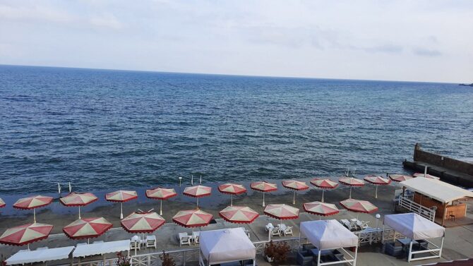 Это, так называемый, «мальтийский пляж» с бетонированной площадкой. На нем установлены шезлонги и зонтики, душевые, кабинки для переодевания. Работает барная стойка. В воду ведет лестница. Глубина нарастает быстро, поэтому здесь не очень комфортно купаться детям. По этой причине и устанавливаются бассейны.