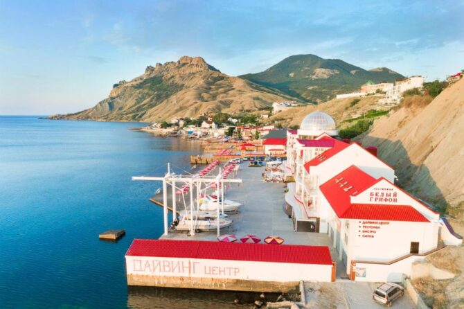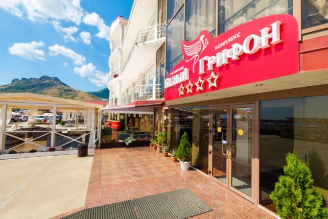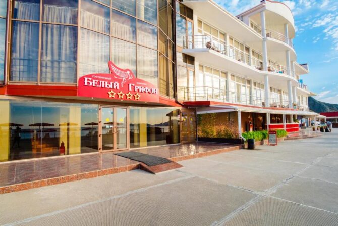 Четырехзвездочный отель «Белый грифон» расположен у самого берега моря. В Коктебеле он является одним из лучших мест отдыха. Гостиничный комплекс занимает часть побережья, имеет собственный пляж, пирс и эллинг. Работает круглогодично. Здесь принимают не только курортников, но и деловых людей, приезжающих для участия в конференциях, семинарах, встречах. В гостинице предусмотрены конференц-зал, уютный ресторан, номера разных категорий комфортности, в том числе апартаменты. На территории открыт единственный в поселке дайвинг-клуб. Комплекс пользуется популярностью и по другим причинам.