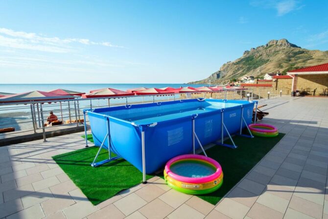 Стационарного бассейна в отеле нет. Море находится в 15 метрах, поэтому нет особой необходимости в их наличии. Но для любителей купаться в пресной воде летом устанавливается каркасный уличный бассейн. Рядом с ним располагается небольшой по глубине (84 см) детский надувной бассейн. Они находятся сразу перед входом на частный пляж.