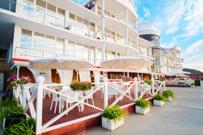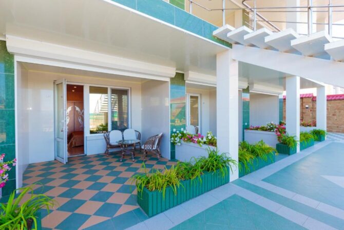 - Апартаменты – эксклюзивный трехкомнатный двухуровневый номер. Установлены панорамные окна, с террасы открывается вид на море. Имеется собственная сауна, приватный пляж, столовая-веранда с оборудованной кухонной зоной, две спальни, гостиная.