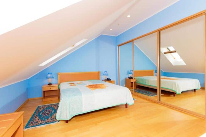 - Эконом-класс. Однокомнатные и двухкомнатные номера находятся на мансардном этаже. Рассчитаны на размещение 3-4 человек. В ванной комнате установлена душевая кабина. Это единственные комнаты, не имеющие собственного балкона.