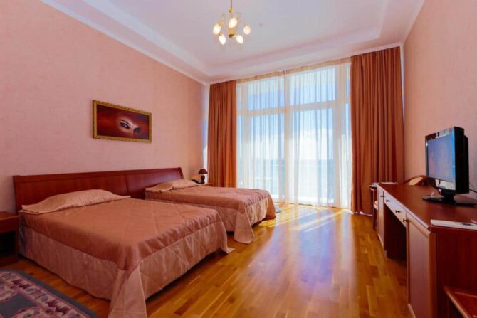 - Стандарт однокомнатный повышенной комфортности. Комнаты находятся в центральной корпусе. Из окон открывается вид на море. Балкон с мебелью, санузел расширенный. Установлена современная многофункциональная душевая кабина с сидением, есть биде.