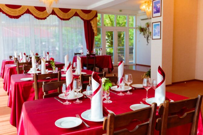 Организацией питания гостей занимается обновленный ресторан отеля «Белый грифон». Основной зал с панорамными окнами рассчитан на 80 посадочных мест. Именно здесь накрывается шведская линия или подается комплексный набор блюд. При бронировании постояльцам предлагаются три пакета проживания: