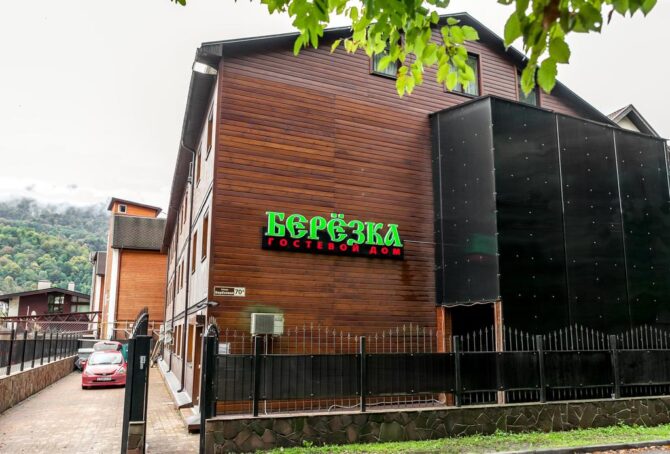 Улица Березовая, на которой построен этот 2-звездочный отель, находится в полукилометре от центра поселка. Это всего 5-7 минут ходьбы прогулочным шагом. Эту тихую улочку давно облюбовали представители сферы гостеприимства, поэтому здесь много других гостиниц, а также ресторанов, кафе и магазинов. Из окон «Березки» открывается вид на Кавказские горы. Трехэтажный корпус с мансардой имеет собственную огороженную территорию. Среди туристов гостевой дом пользуется спросом благодаря низким ценам на проживание, относительно комфортными номерами и приятным обслуживанием.