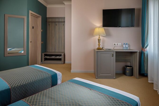 Стандартные номера обладают приятным лаконичным интерьером. Общая площадь составляет 18 квадратных метров. Включает в себя одну двуспальную кровать или две односпальные. Для гостей отеля предусмотрены комфортабельные спальные места с ортопедическими матрасами и спальными принадлежностями высокого качества. Простыни, наволочки и пододеяльники белого цвета и приятны для тела. Прямо из окна вы сможете наслаждаться живописным видом на горные вершины, море и часть поселка. В комнате находится сейф, где отдыхающие могут хранить все свои ценные вещи. Это идеальный экономичный вариант для одиноких туристов или семейной пары.