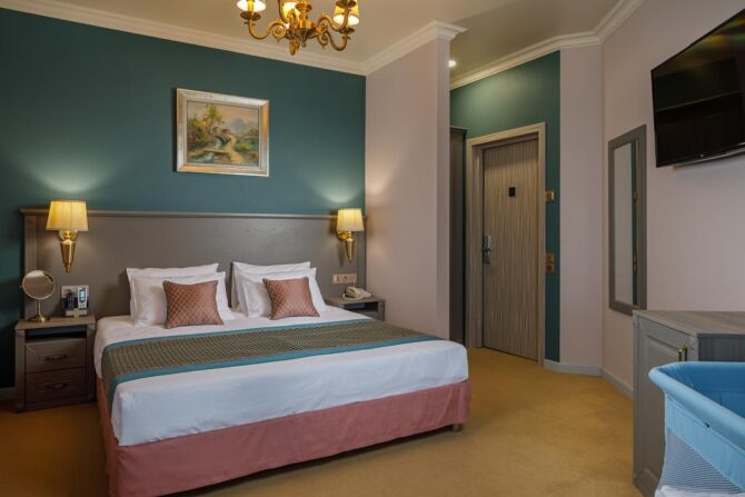 Идеальный вариант для семьи из 4 человек и более или компании. Включает в себя большую двуспальную кровать и диван-кровать. Разместиться могут сразу 5 человек. Также доступно дополнительное место по запросу. Площадь составляет 22 квадратных метра. Роскошный интерьер придется по душе каждому туристу. В номере есть все необходимое для комфортного проживания. Все туалетные принадлежности выдаются бесплатно. В комнате есть балкон, откуда открывается прекраснейший вид на Черное море и горы. Постельные принадлежности класса люкс приятны для тела. В просторной комнате имеется система кондиционирования, мини-бар и многое другое, что сделает обстановку уютной как дома.