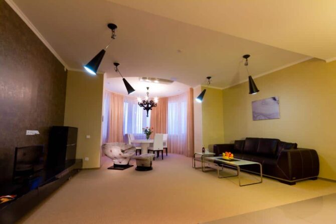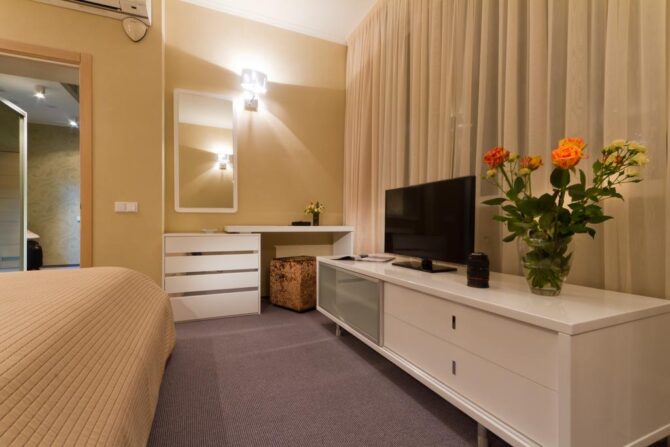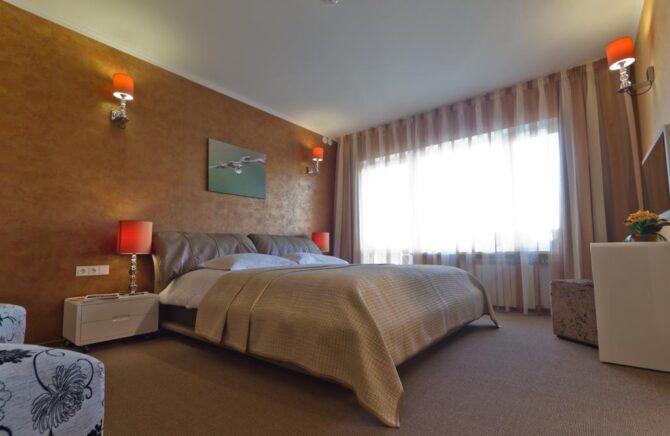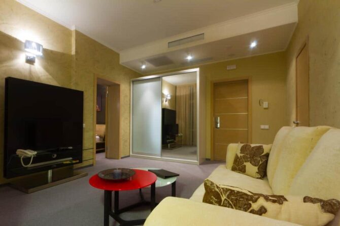 - Полулюкс. Это двухкомнатная квартира с двумя кроватями и удобной мебелью. Есть номера, спроектированные для людей с ограниченными возможностями.