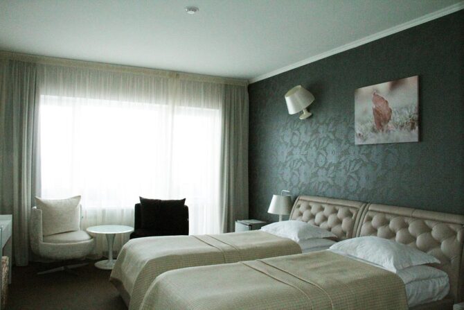 - Стандартная двухкомнатная квартира. Просторные апартаменты, разделенные на две зоны: спальня и гостиная. Вариант аналогичен предыдущему. Есть две раздельные кровати.