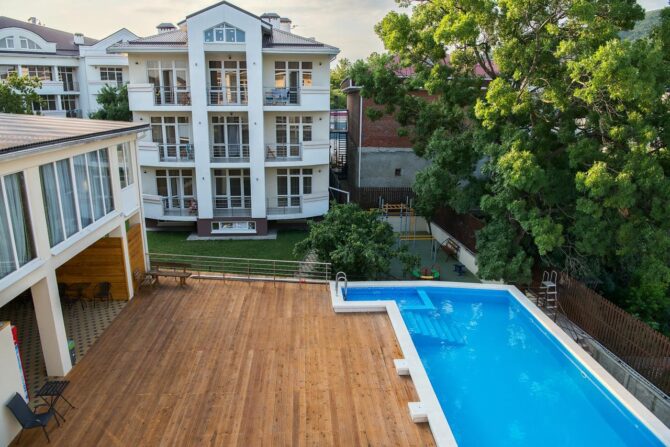 Во дворе есть просторный бассейн, который подогревается. Есть несколько детских площадок и зона отдыха, в которой есть мангал. Шашлык можно готовить в любое время года.