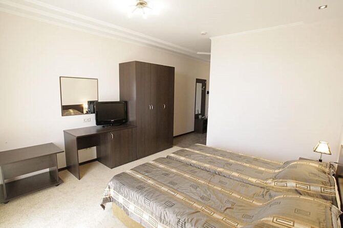 Места действительно много. Каждый день персонал отеля делает уборку. В стоимость номера входит завтрак. Обед и ужин оплачивается дополнительно. В отеле есть меню, с помощью которого можно заказать еду в любое время. Еще есть баня. Этот факт не оставит равнодушными мужскую половину посетителей. Есть парковка во дворе. Если машины нет, можно заказать любой трансфер с помощью ресепшн. До моря примерно 10 минут. Так как отель находится в центре поселка, найти пляж будет не проблема.