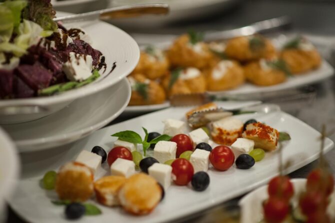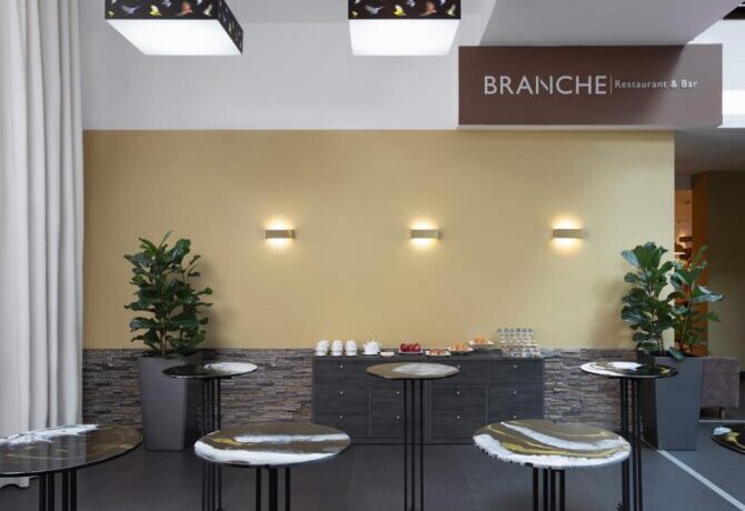 На территории работает ресторан Branche. Шеф-повар специализируется на европейской кухне, в меню представлено много авторских блюд. Завтрак изначально заложен в стоимость проживания. Он накрывается в формате шведской линии. «Шведский стол» ждет постояльцев во время обеда и ужина. Цена фиксированная. Можно оформить тариф «Полупансион», в который входят завтрак и ужин.