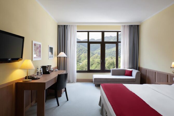 За полвека своего существования бренд разработал четкую систему и количество номеров. В Голден Тюлип Роза Хутор представлено 162 комфортабельных номера разной ценовой категории. Стандарт имеет площадь 25 кв.м. Он рассчитан на 2-х человек, но по просьбе постояльцев может вместить и троих (ставится дополнительное спальное место). Это самый дешевый вариант. Его стоимость на ноябрь [y] года составляет 3026 руб./сутки. Чуть дороже и больше по метражу (27 кв.м) – стандарт с видом на реку и горы. В нем установлены панорамные окна с плотными шторами. Супериор (36 кв.м) на сегодня является самым востребованным вариантом. Он также рассчитан на проживание двух человек. В отличие от стандартов, здесь есть кофемашина и сейф для хранения документов и ценных вещей. Во всех вышеперечисленных номерах установлены душевые кабины.