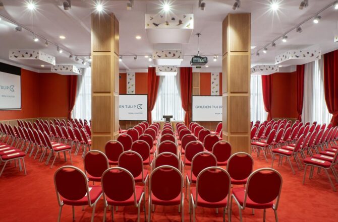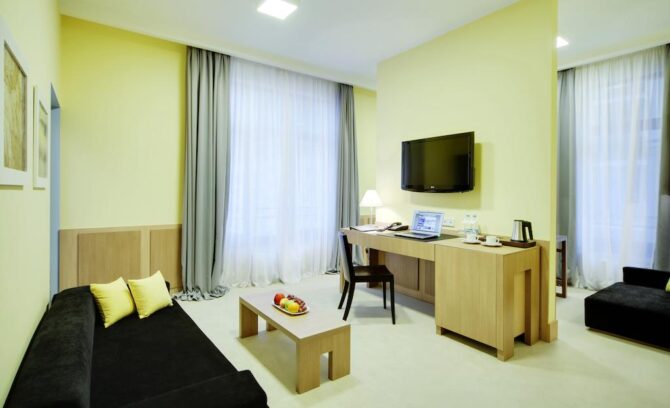 Полулюксы и люксы имеют полноценные ванные комнаты. Полулюкс рассчитан на 4-х гостей. Его площадь – 56 кв.м. По виду он больше напоминает евростудию, где помещение разделено на 2 части: гостиная и спальня. Чтобы гости долго не ждали своей очереди, в ванной установлены 2 раковины. 65-метровый люкс оснащен по мировым стандартам. Он состоит из двух отдельных комнат – просторной гостиной и уютной с панорамными окнами спальней. В Голден Тюлип обычно люксы соседствуют с супериорами, и для удобства гостей могут быть объединены.