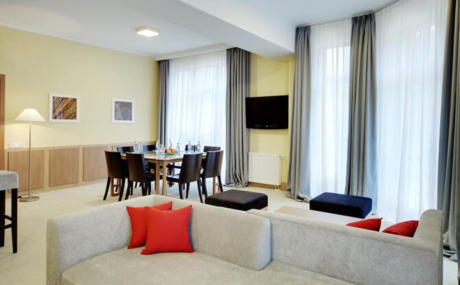 Самым комфортабельным является Представительский люкс. На его площади в 96 кв. метров могут спокойно разместиться до пяти человек. В номере есть отдельная спальня, кухня, обеденная и гостиная зоны, 2 санузла. Рядом всегда располагается один из Стандартов. В случае необходимости их соединяют.