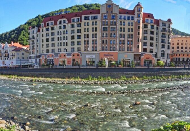 Немаловажную роль играет удачное расположение комплекса в центре поселка Эсто-Садок. Отель построен на набережной Панорама. Это солнечный берег реки Мзымта. В 200 метрах находится живописное озеро Rosa Beach с пляжной зоной. В 2-х километрах проходят железнодорожные пути с остановкой на станции «Роза Хутор». До черноморских пляжей – 52 км. В летний сезон на побережье можно доехать на общественном транспорте или воспользоваться организованным отелем трансфером.