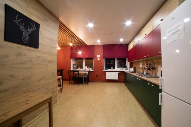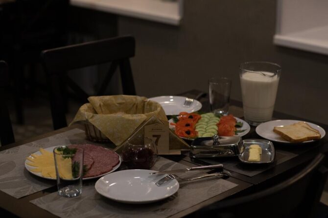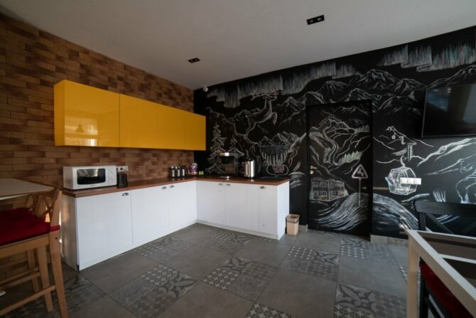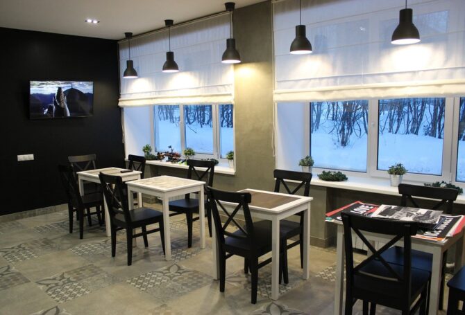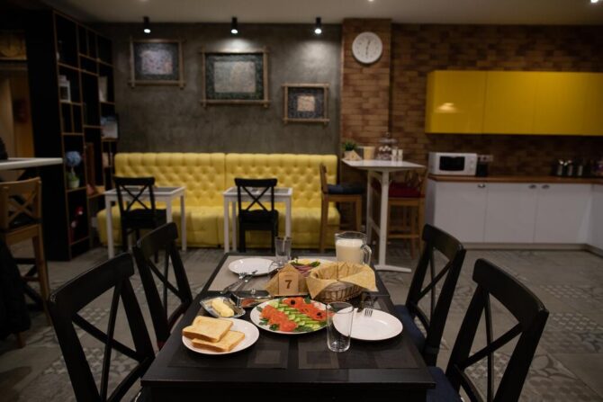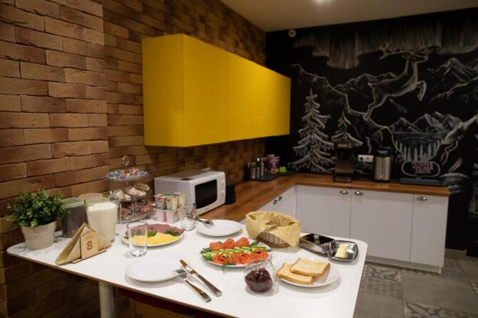 В стоимость проживания входит завтрак по системе «шведский стол», который накрывают в светлом и уютном зале с 7 до 10 утра. Помимо завтраков гостиница предлагает обеды и ужины. А если вы предпочитаете собственноручно приготовленные блюда, воспользуйтесь специально оборудованной удобной кухней, которая располагается на 2 этаже. В ней есть все необходимое: холодильник, термоспот и СВЧ печь и несколько обеденных столиков. Или выбирайте для отдыха номера категории «Люкс». Они оборудованы отдельной мини-кухней, что гарантирует вам уединение и покой. На территории отеля можно пользоваться высокоскоростным Wi-fi бесплатно.