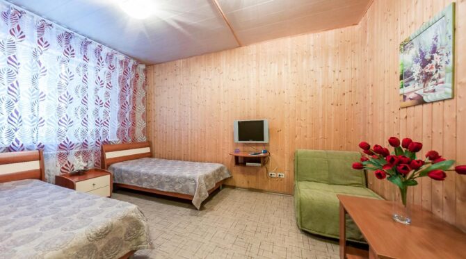 - семейный номер-студио – площадь 30 м2. Делится на несколько зон – спальную, обеденную и зону отдыха. Максимальная вместимость 5 человек. Спальные места обеспечиваются одной большой кроватью, раскладывающимся диваном и креслом-кроватью. Обеденная зона представляет собой небольшую кухню с плитой, холодильником, чайником, посудой и столом. Для хранения ценных вещей имеется сейф;