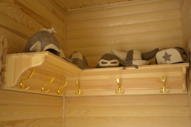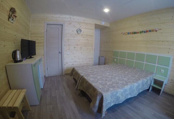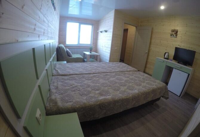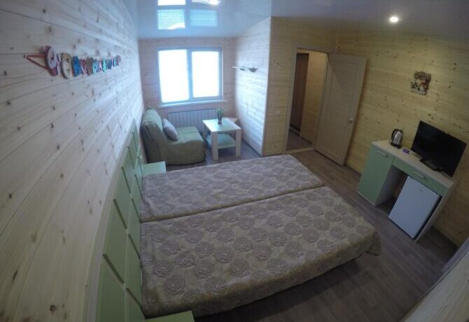 - улучшенный двухместный – его площадь всего 20 м2. Может быть укомплектован одной двуспальной кроватью, либо двумя полуторными. Допускается проживание троих человек, дополнительное спальное место обеспечивает раскладное кресло-кровать. Кухни нет, но имеется чайник, холодильник, набор посуды. Все номера данного типа выходят на общую веранду. При входе есть отдельное помещение, где установлена стойка для лыж и сноубордов, вешалка для верней одежды. В ванной комнате оборудована душевая кабина;