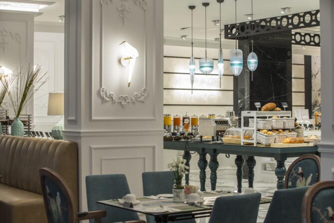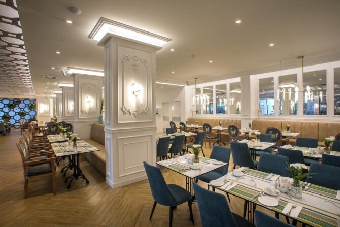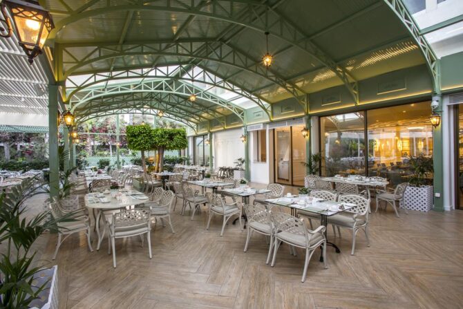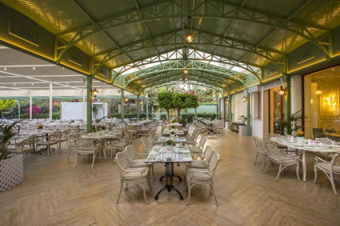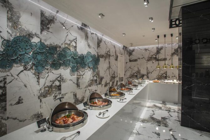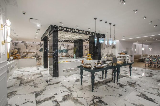 Дополнит положительные впечатления от отеля шикарный шведский стол. Если на завтрак предлагаются традиционные варианты начала дня, то на обед предпочтение отдается свежим овощам и морепродуктам, на ужин – мясу. Вечерний прием пищи на открытой террасе с живой музыкой по своей атмосфере легко заменит поход в хороший ресторан.