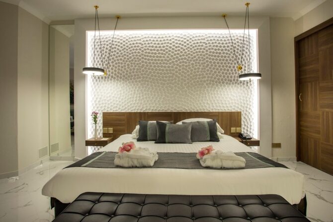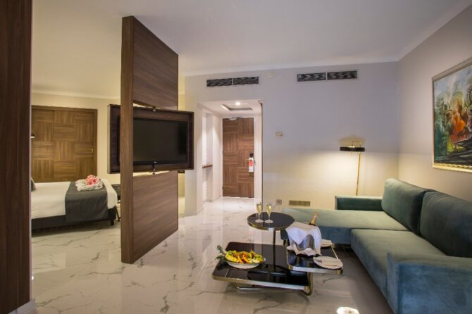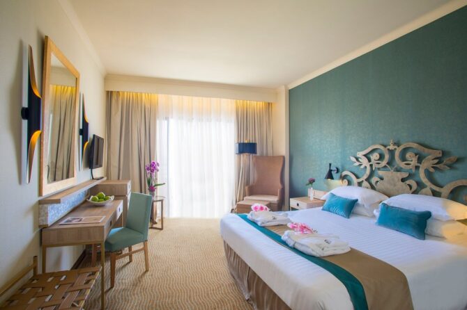 По приезде гостей ждет комплимент от менеджмента отеля — тарелка фруктов и вода в номере. Просторный, в приятных бирюзовых тонах, он имеет балкон, с которого открывается чудесный вид на море и зелёное побережье. По описанию с сайта отеля, таких комнат 80 процентов. Но всё же один совет при выборе категории номера: бронируйте Sea View и ставьте ремарку о верхнем этаже – тогда ваши кипрские вечера станут одними из самых романтичных в жизни.