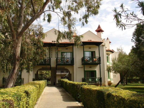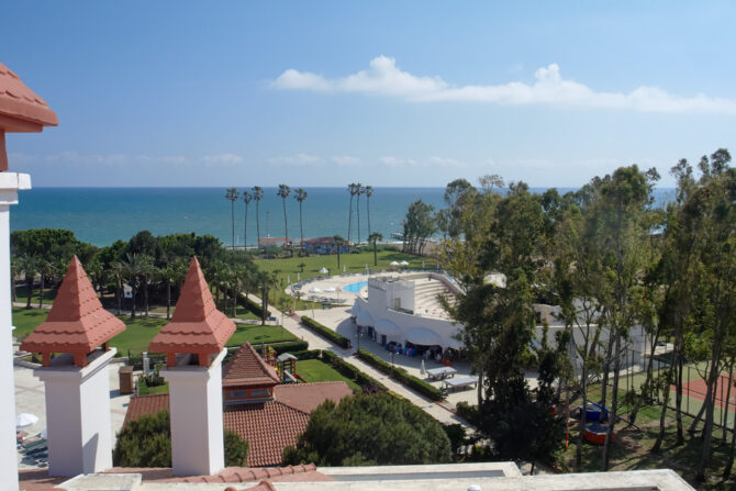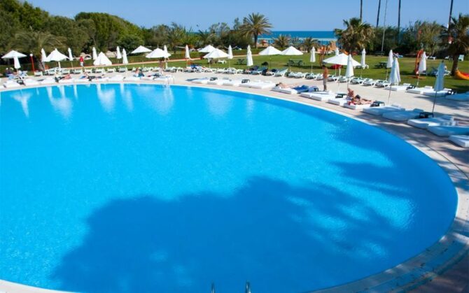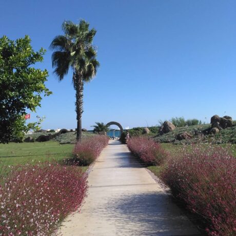 Территория зеленая с богатой растительностью — вокруг пальмы, сосны, газоны, мандариновые деревья, эвкалипты. Пляж самый длинный в городе. Здание выглядит фешенебельно, стеклянные лифты гармонично вписываются в фасад. Отель работает больше 10 лет, но постояльцев меньше не становится — постоянство говорит о многом.