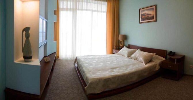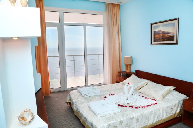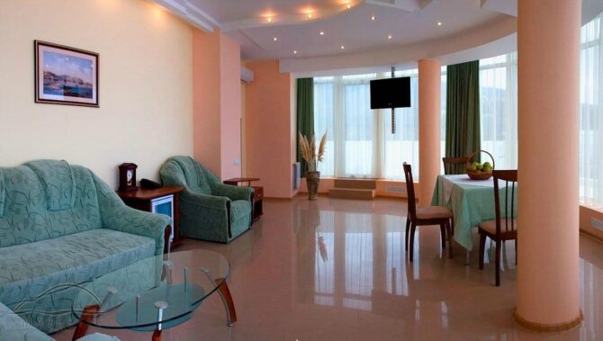 - Апартаменты (70 кв. м) – двухкомнатный номер премиум-класса с видовой террасой для загара. И окон открывается вид на море, гору Аю-Даг и мыс Плака. Других особых преимуществ нет. В зале имеется обеденная зона, но нет кухни. Дополнительные спальные места предусмотрены на диване.