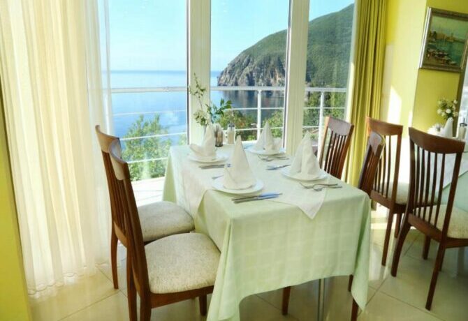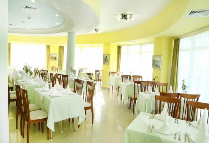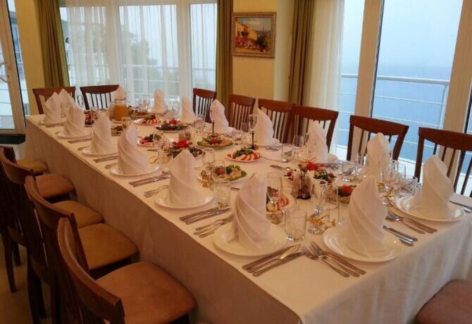 Обеденный зал находится в панорамном помещении. Из его окон открывается круговой обзор местных природных красот. В меню за отдельную плату представлены блюда средиземноморской, европейской и авторской кухни. Здесь можно заказать фуршет, банкет, деловой обед, семейное или корпоративное торжество.