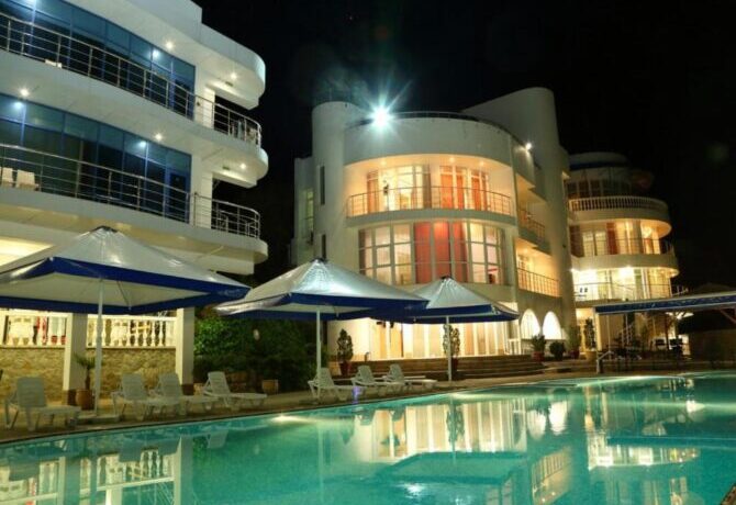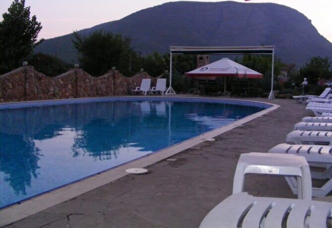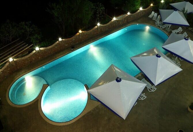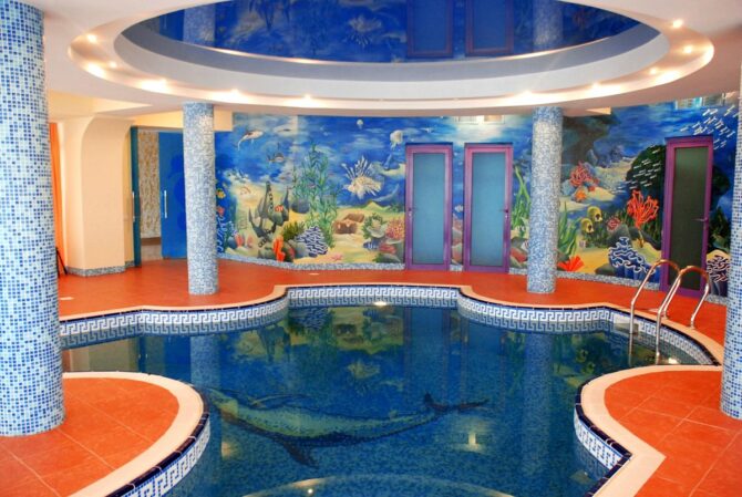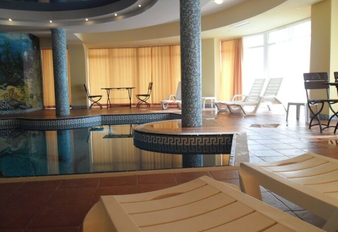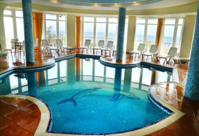 Отель предоставляет бесплатную возможность пользоваться двумя бассейнами. Крытый находится в СПА-зоне и работает круглогодично. Открытый находится перед главным корпусом. Вода пресная, подогревается. Имеется гидромассажное отделение. Рядом установлена барная стойка с разнообразными напитками и коктейлями. По периметру расположены шезлонги с зонтиками. С территории видна Медведь-гора, а также сливающееся с горизонтом море. У открытого бассейна проводятся развлекательные мероприятия. В частности, музыкальные вечера или тематические программы.