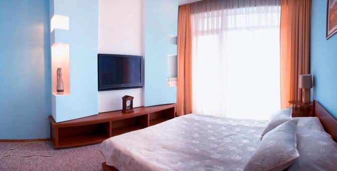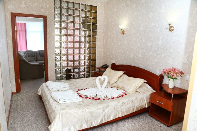 - Люкс (50 кв. м) – двухкомнатный номер рассчитан на проживание от 2 до 4 человек. Балкон или терраса укомплектованы летней мебелью, в ванной комнате установлена душевая кабина. Дополнительные спальные места предусмотрены на раздвижном диване в гостиной.