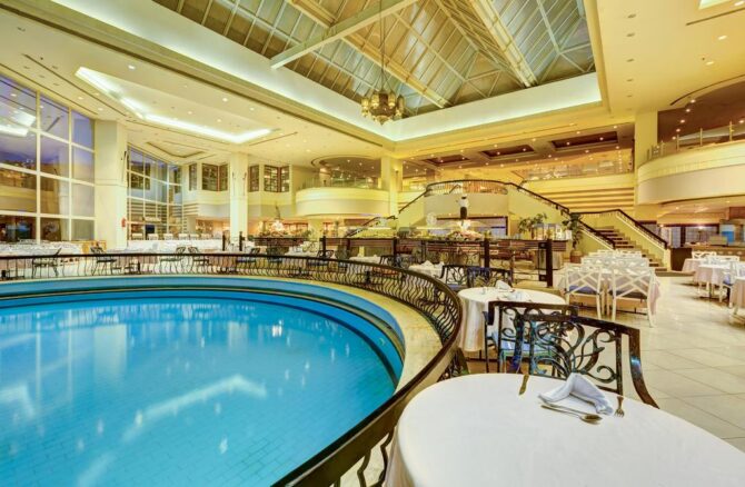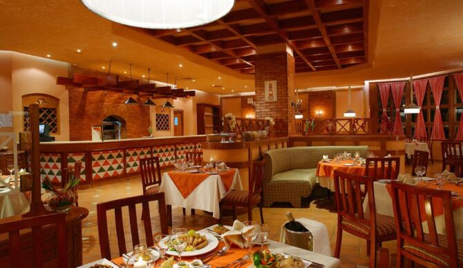 Питание по системе «Все включено» (AI), которая действует с 9:00 до 23:00. Сюда входит трехразовое питание (привычный шведский стол) в ресторане с романтичным названием Hill view Main Restaurant, и различные напитки, закуски и сладости в трех барах: у бассейна, в лобби-баре и в пляжном баре. Также за отдельную плату можно посетить еще 2 ресторана (рыбный и ливанский) и диско-бар.