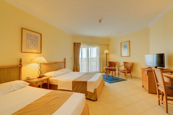 Обстановка в номерах традиционная: санузел с феном, кондиционер, спутниковое ТВ, телефон, в каждом номере балкончик или терраса, платные сейф и мини-бар. Уборка ежедневно, также можно договориться о ежедневной смене постельного белья.