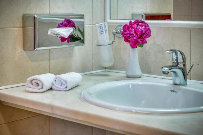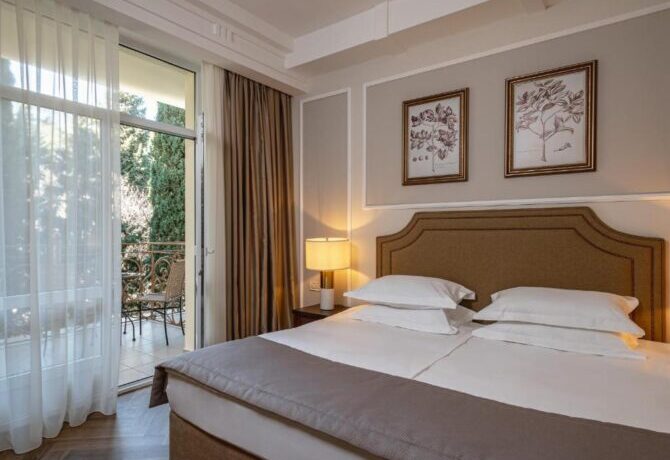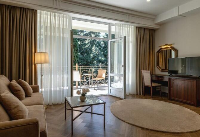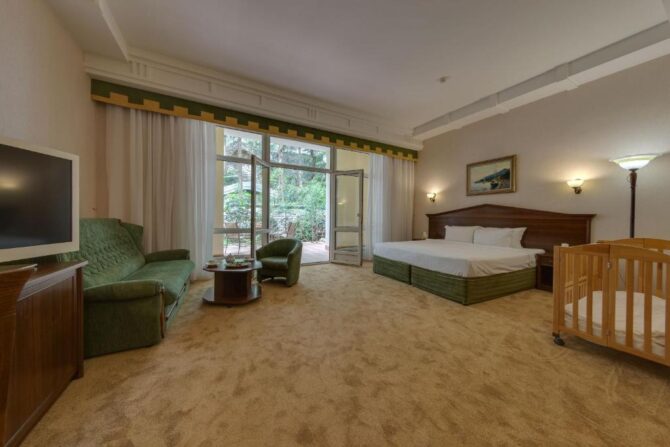 Номера «Стандарт» и «Улучшенный» бывают площадью 20-25 кв. метров и рассчитаны на проживание двух человек. В центре комнаты стоит двухместная кровать или две одноместных на выбор, напротив расположена плазменная панель со смарт-приставкой. Есть номера с балконом, с террасой и без них. В одних санузел располагает душевой кабиной, в других глубокой ванной. Оснащение обычное: фен, сейф, платный мини-бар и холодильник. К электрочайнику предусмотрены чай, кофе и питьевая вода. Из текстиля в положенный набор входят тапочки, халаты, полотенца и минимальный косметический комплект. Цена номера зависит от включения питания: завтрак, полупансион, полный пансион или ничего. «Супериор» площадью 25 кв. метров вмещает до 4-х человек, поскольку имеет дополнительный раскладной диван и журнальный столик. «Супериор семейный» при площади в 30 кв. метров вмещает до 5 человек. Как понятно из названия – это излюбленный номер у семей с детьми.