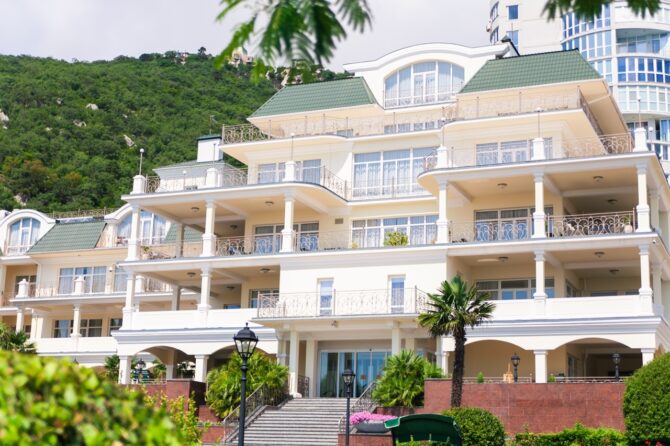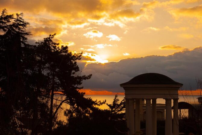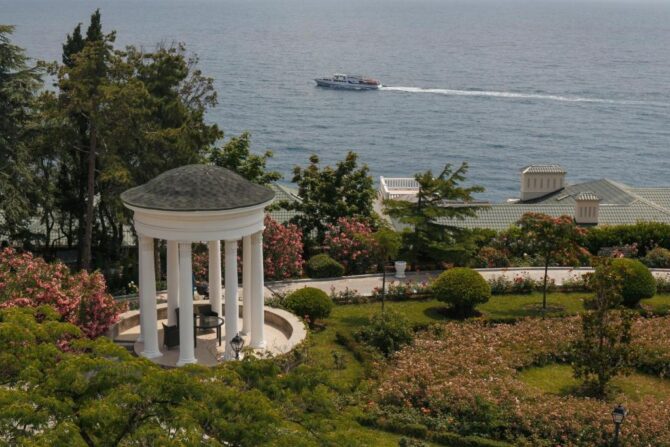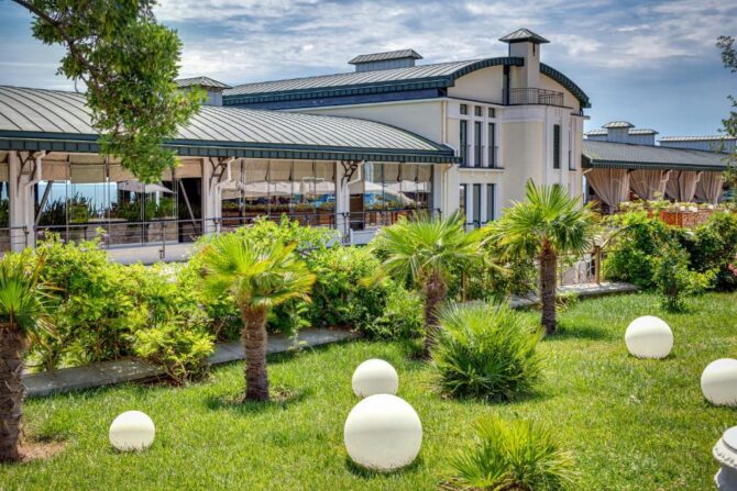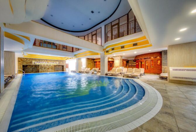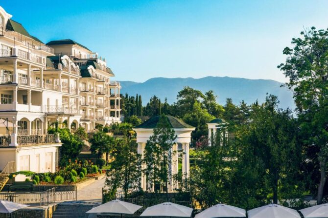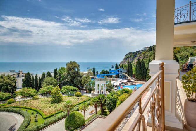 Спа-отель «Пальмира Палас» располагается недалеко от Ялты в местечке Курпаты и имеет заслуженные 4 звезды. Спа-центр с мини-аквапарком, розарием, медицинским центром так и вовсе тянет на пять звёзд.